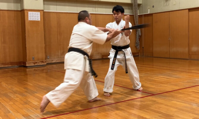 1月10日の稽古始めでは普段の練習に加え、横関先生による三十六(サンダイルイ)や、棒取り、バット折りなどの演武も行われ、充実した稽古となりました。